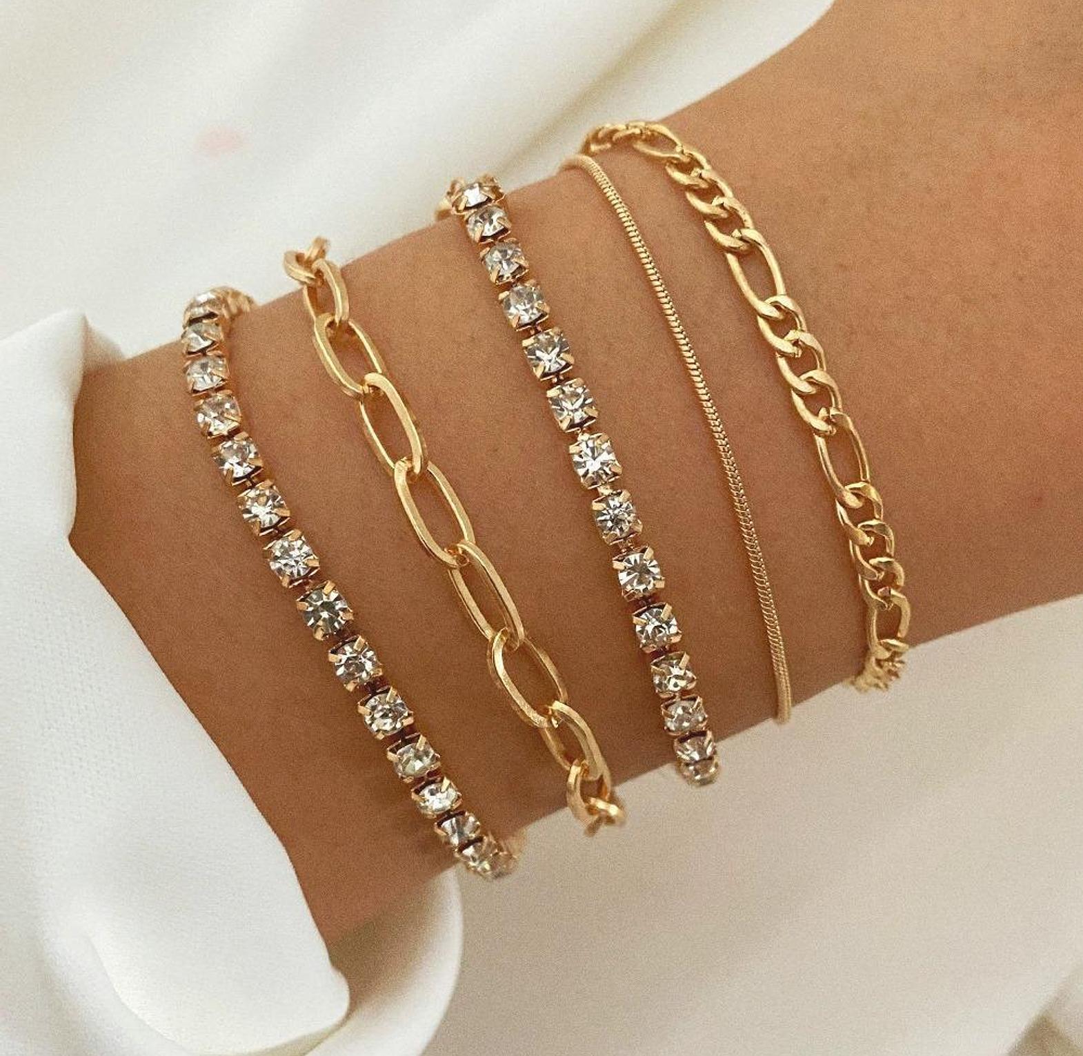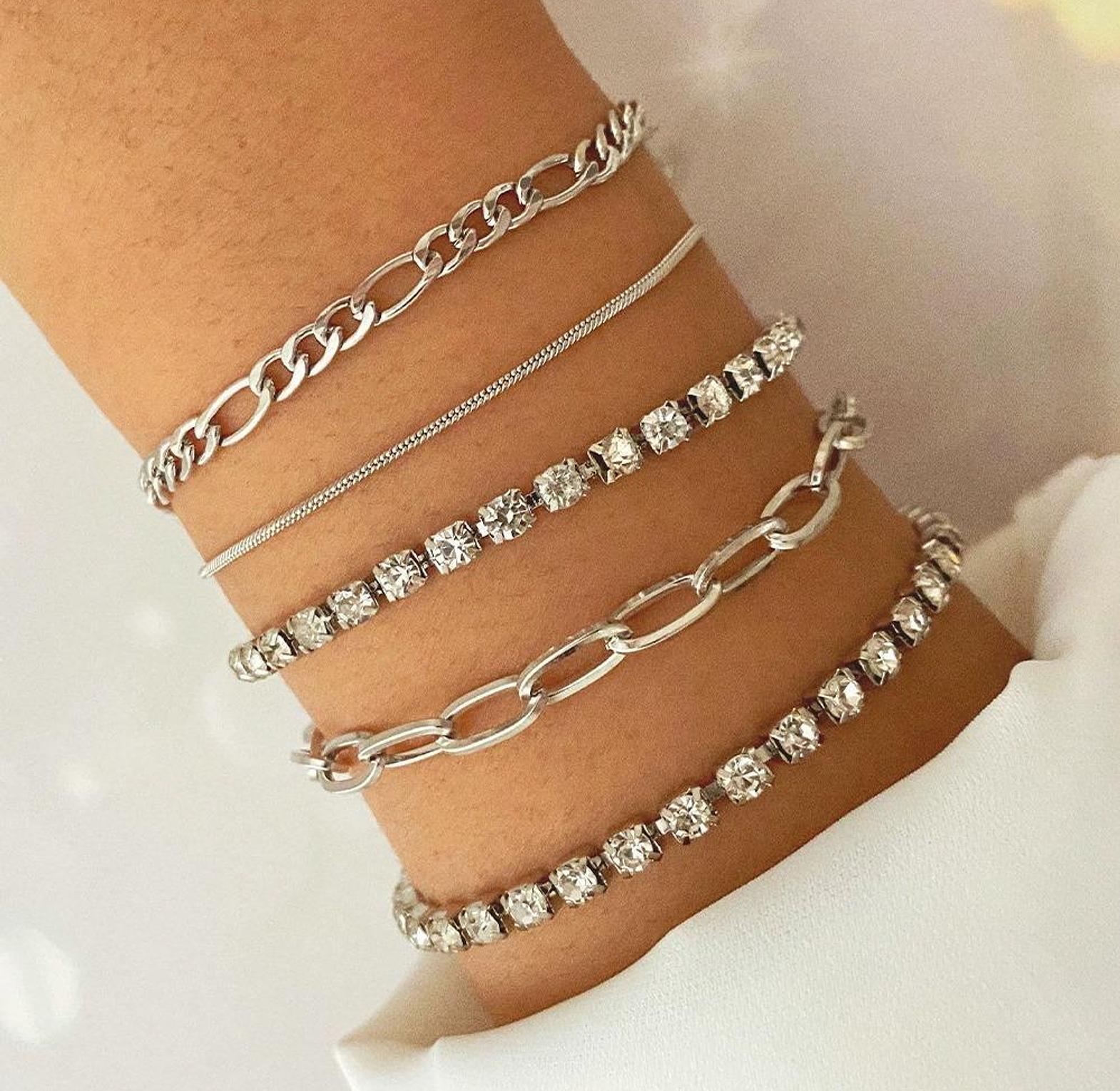 This is a silver or gold tone 5-piece layered rhinestone and chain bracelet set.