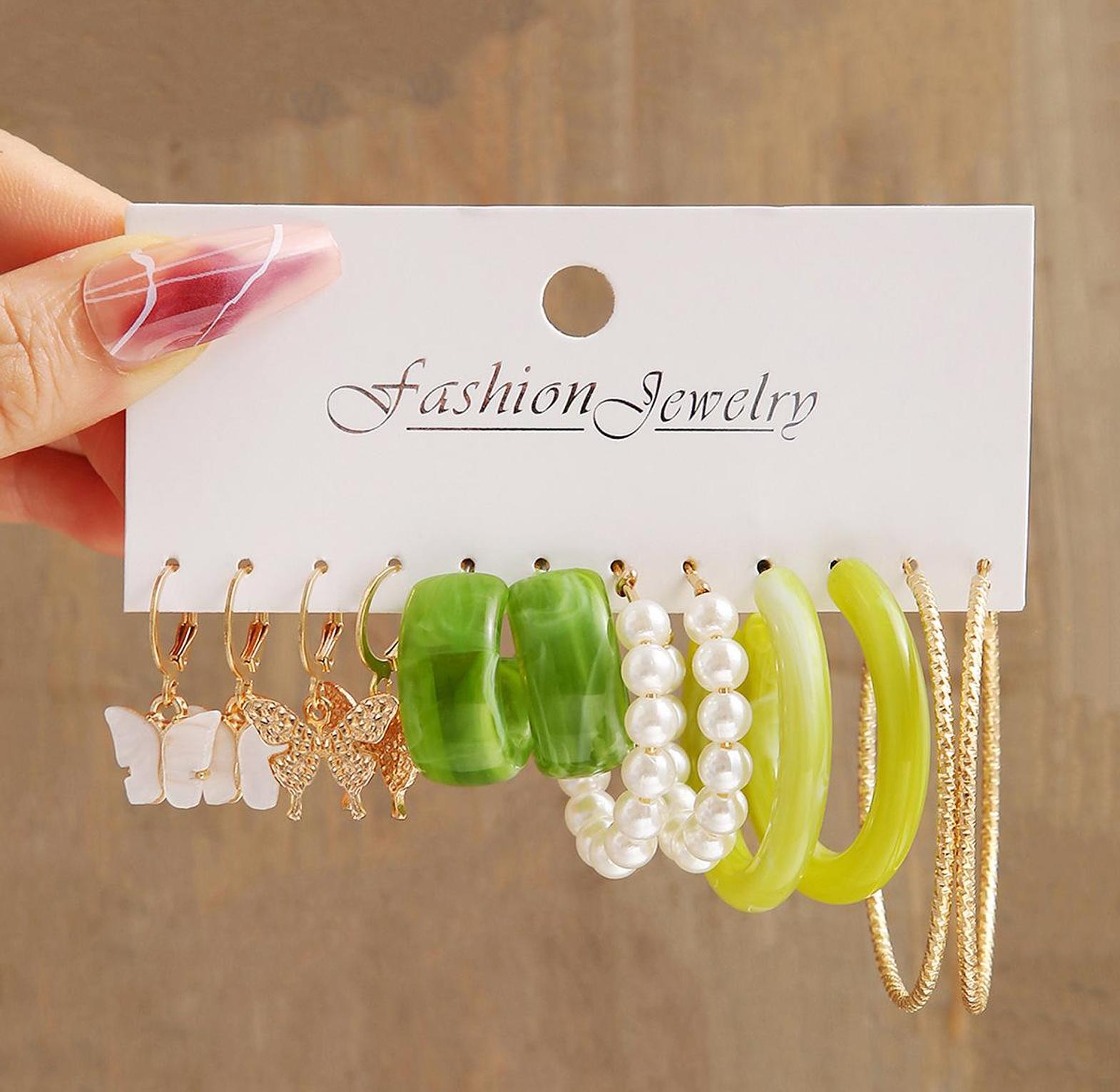 This is a set of assorted fashion earrings, including gold-toned butterfly charms, green resin hoops, and faux pearl hoops.