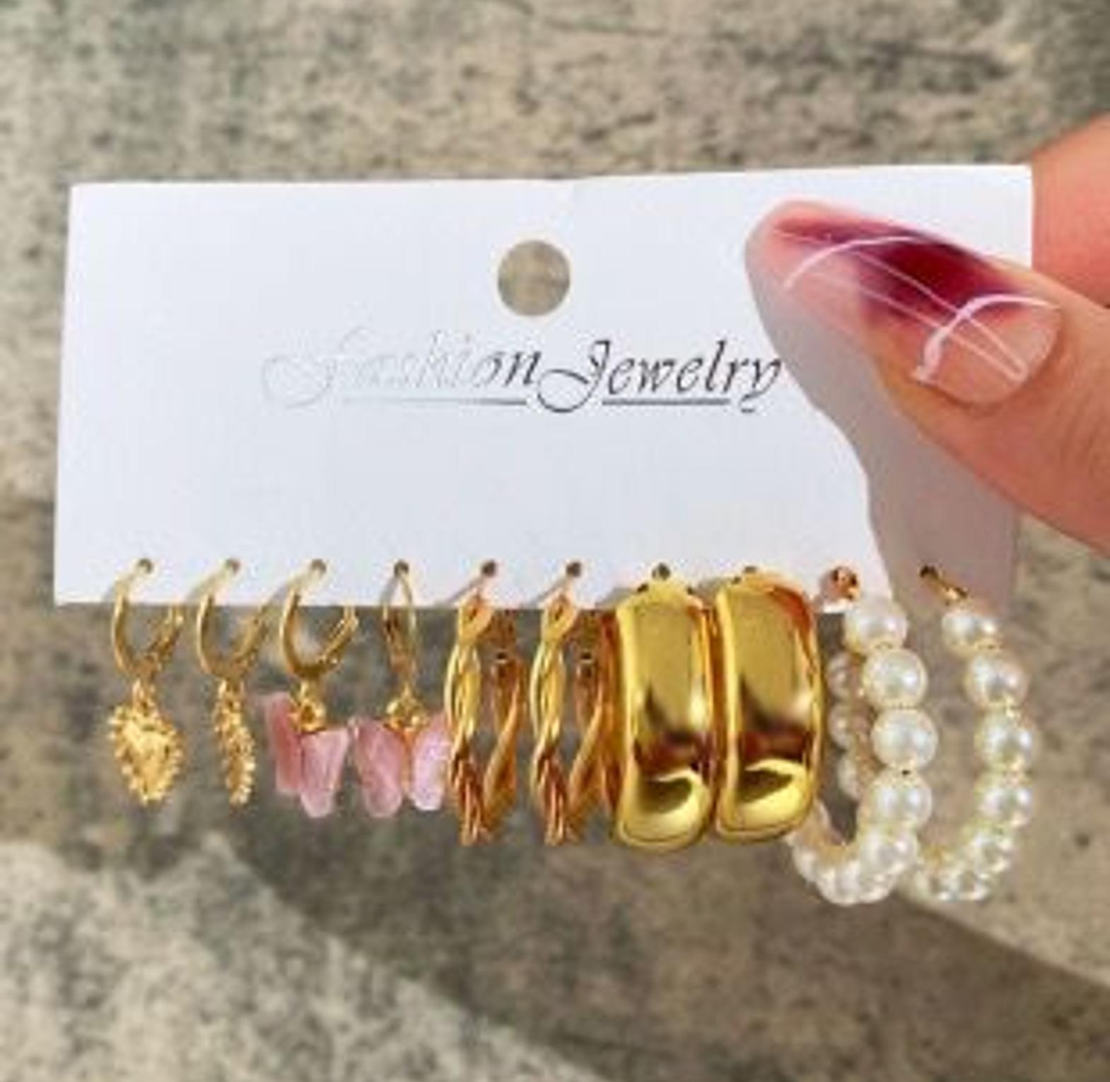 This is a set assorted gold-tone fashion earrings, featuring various hoop styles, pearl-embellished hoops, and charm drops.