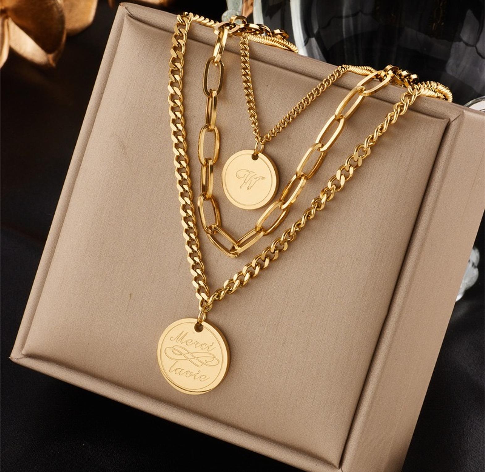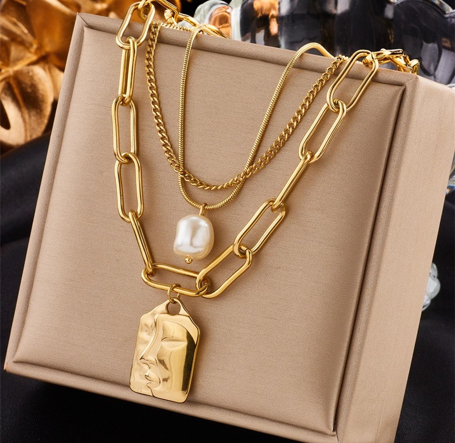 A beautiful layered necklace set crafted from high-quality stainless steel for long-lasting shine and durability. It features three gold chains: a bold paper-clip chain with an abstract face pendant, a mid-layer chain, and a delicate chain accented with a natural-style pearl.