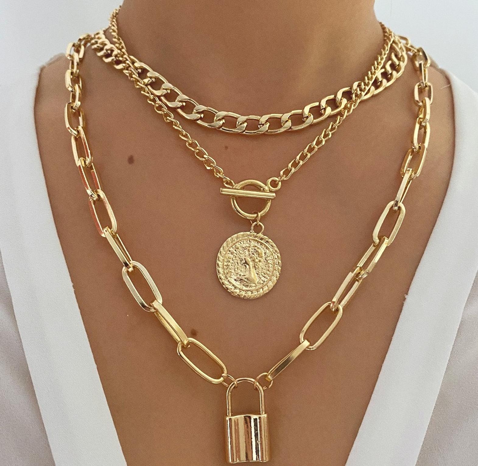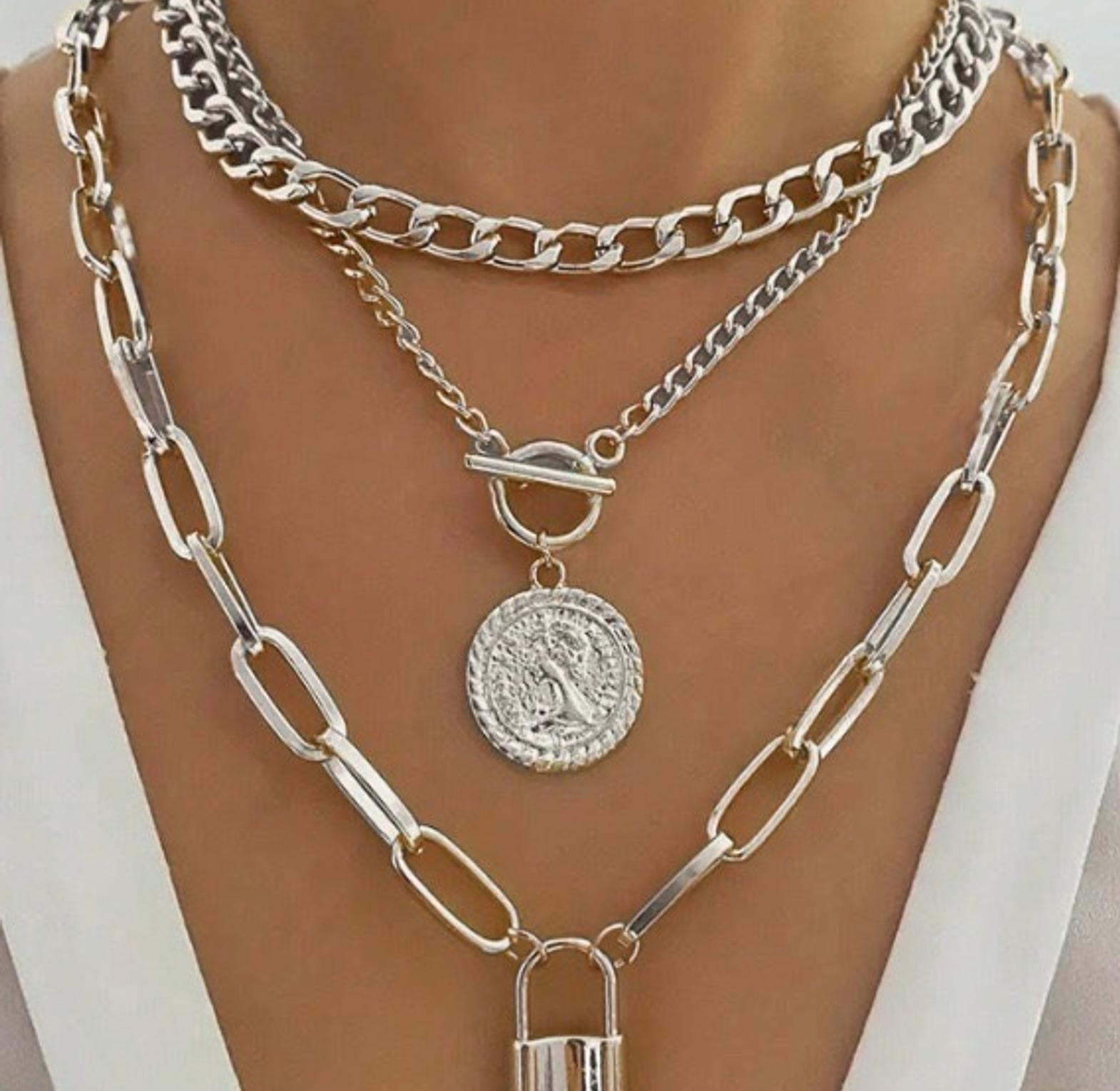 A stylish three-layer silver necklace featuring a chunky chain, a coin pendant, and a padlock charm. Perfect for adding a bold, modern touch to any outfit. Lightweight, easy to style, and designed to make your look stand out.