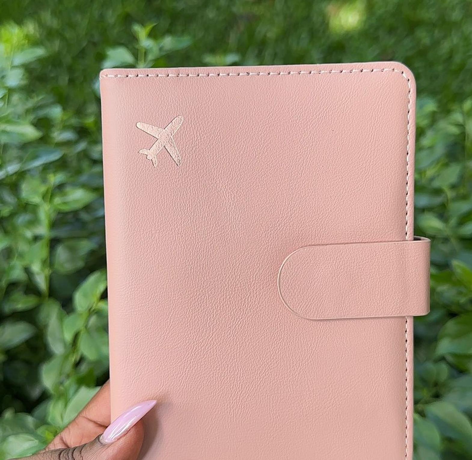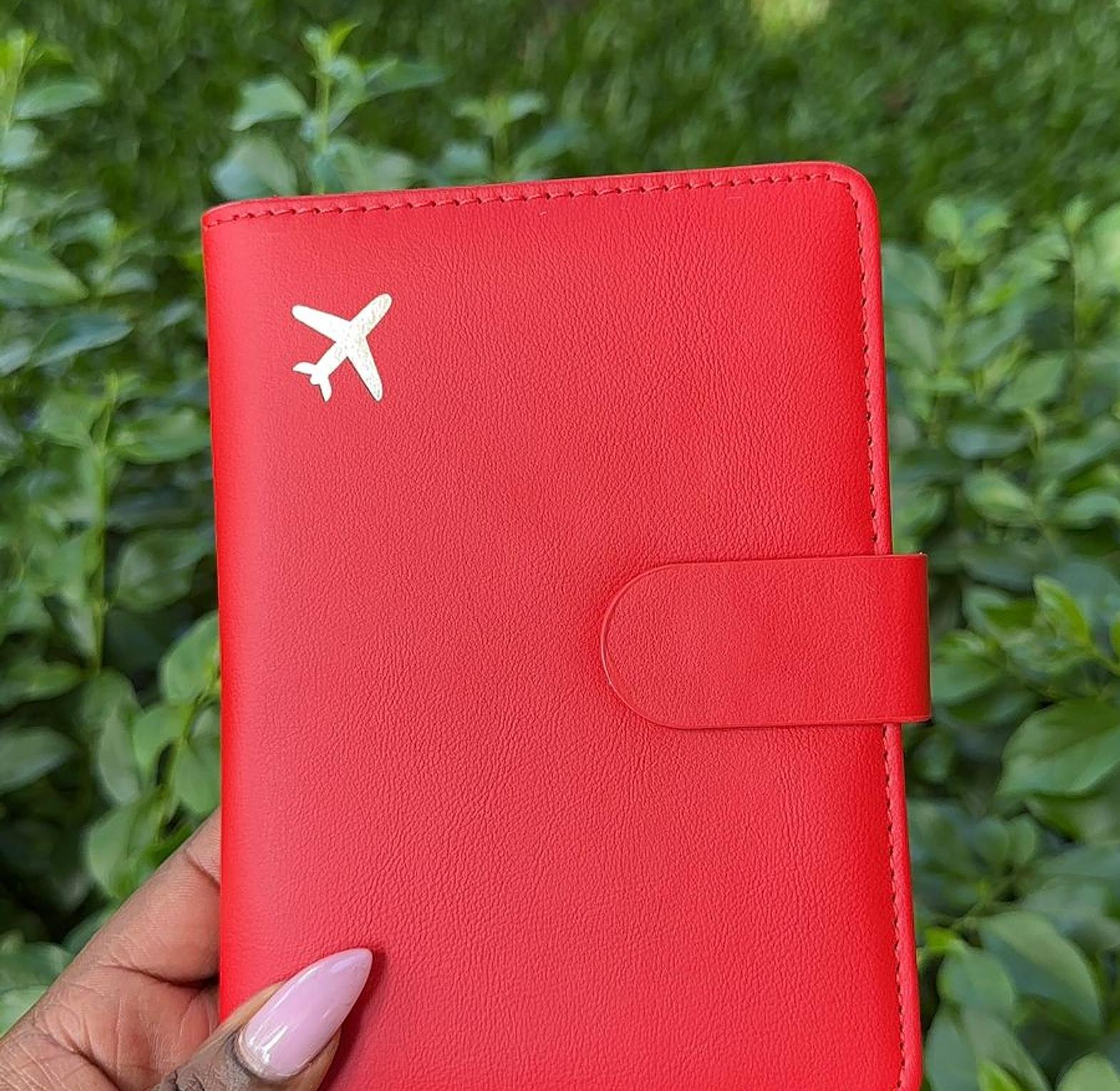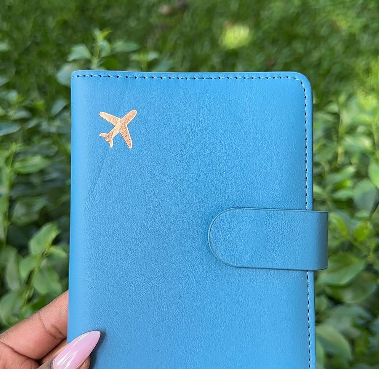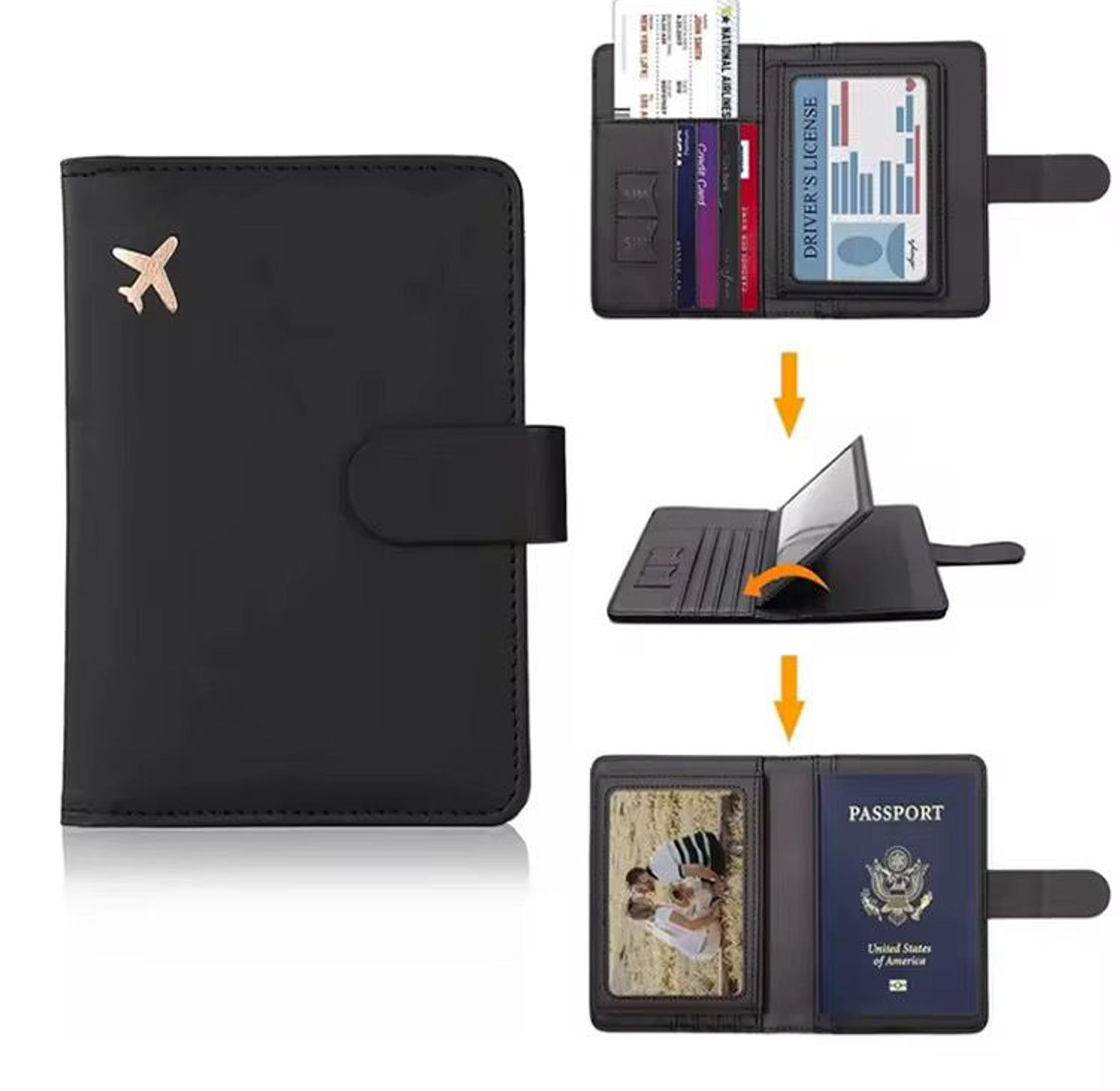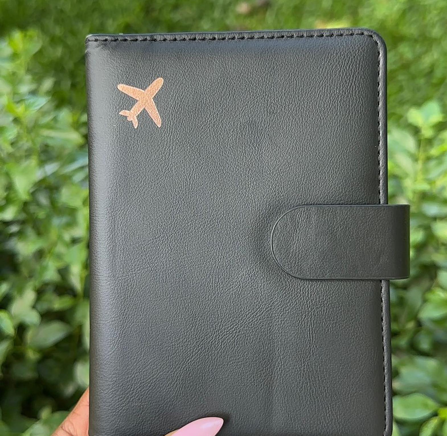 It features a minimalist design with a small airplane logo on the front. The holder has a snap button closure to secure travel items. It can hold a passport, cards, cash, tickets, and other documents.
