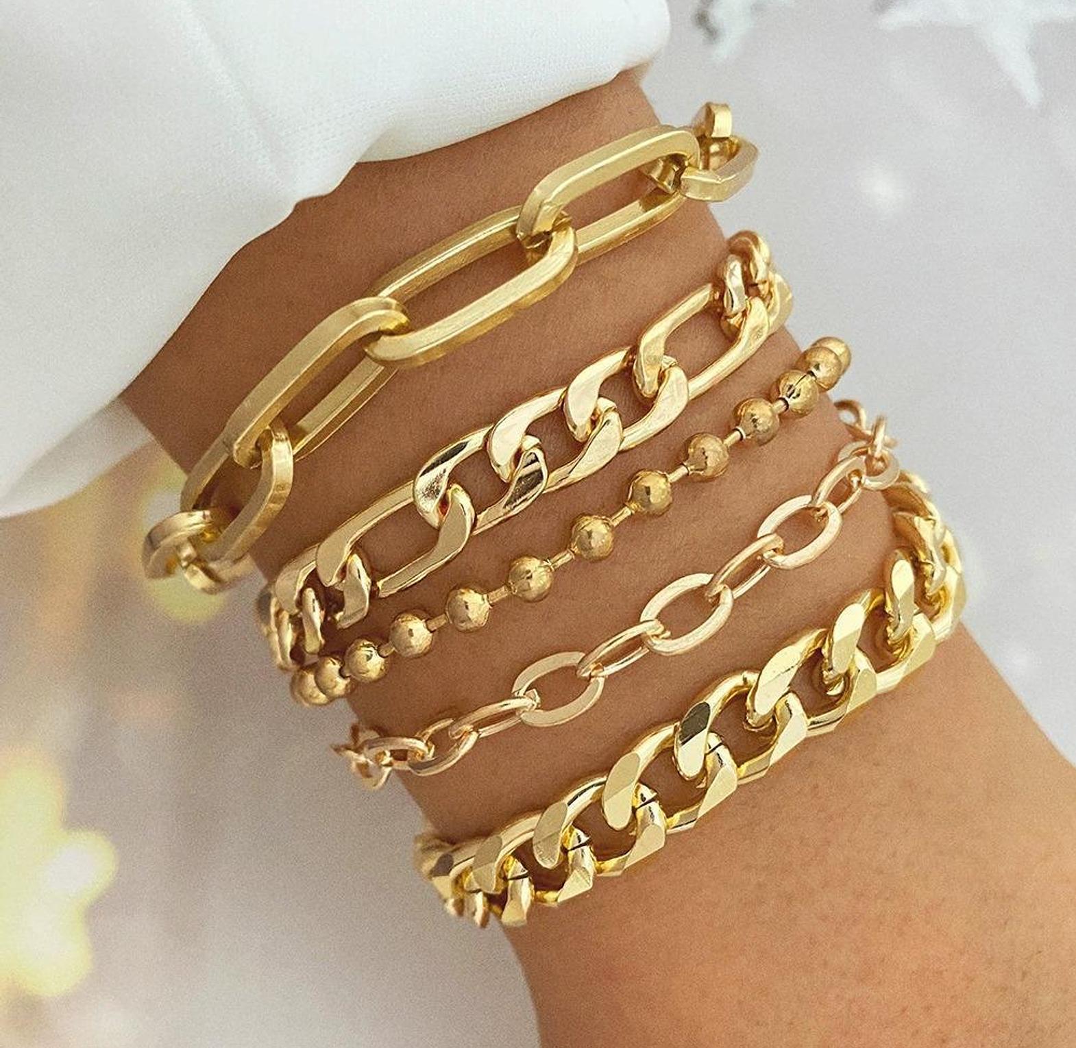 This is a set of gold-plated, multi-layered chain bracelets made of alloy. The set features various chain styles, including Cuban, oval link, and beaded designs.