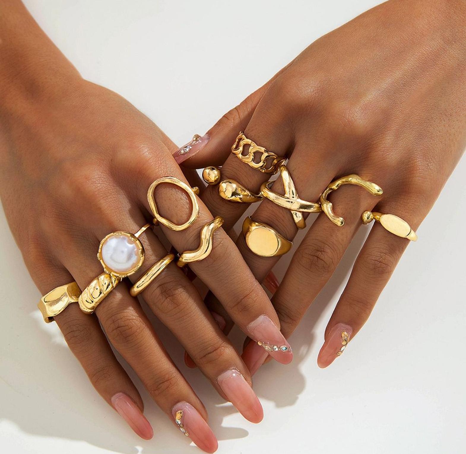 A set of three bold, gold-plated rings featuring chunky silhouettes and abstract, irregular dome shapes, perfect for creating a high-fashion, layered look.