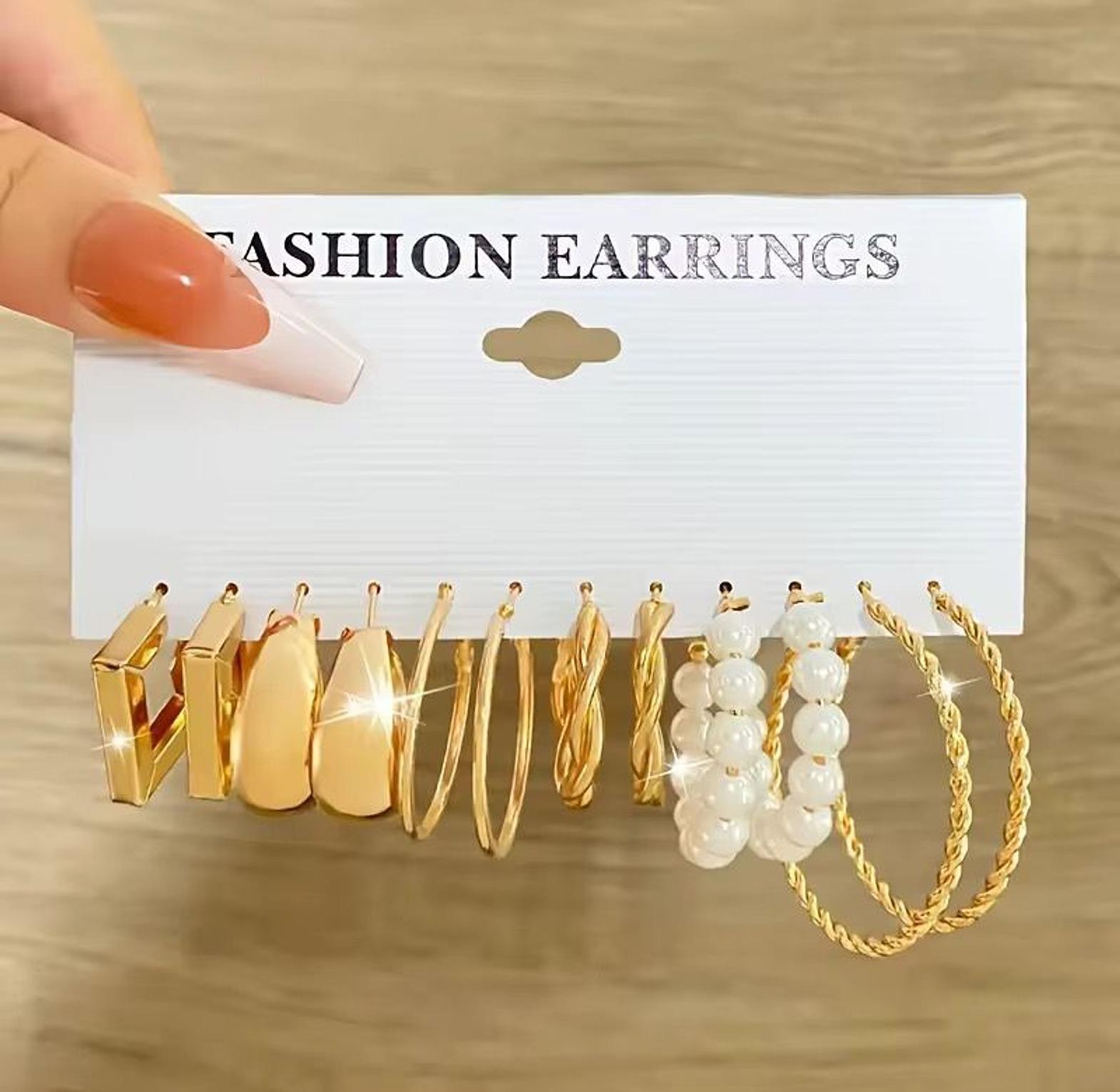 This is a set of gold-toned fashion earrings featuring various hoop styles and white faux pearls.