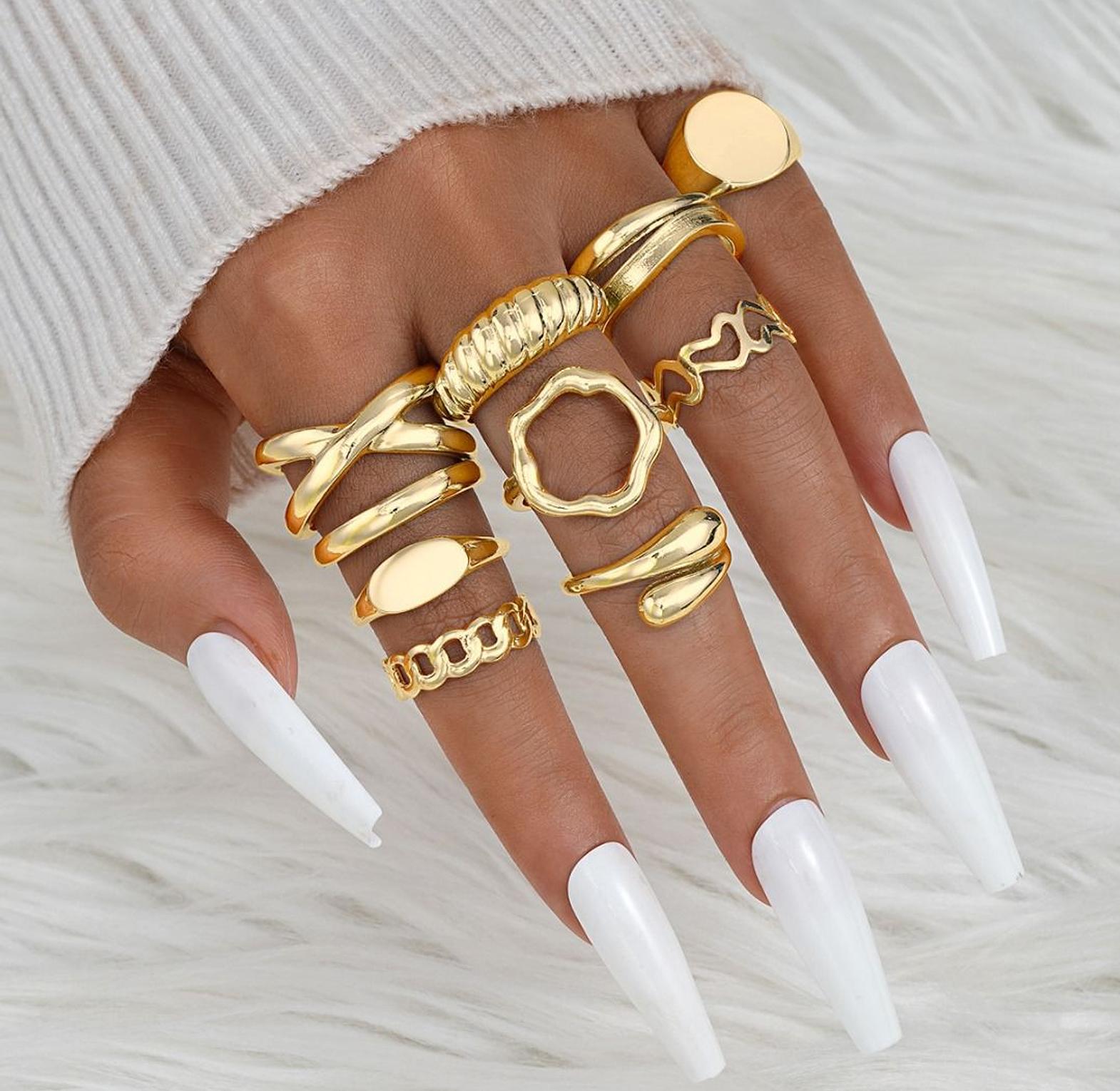 Unleash your inner style icon with this extensive 10-piece ring collection, designed for the individual who loves a bold, curated jewelry statement. This set combines various styles, making it incredibly versatile for creating a full "ring party" effect or wearing individual pieces for a subtle touch of contemporary glamour.