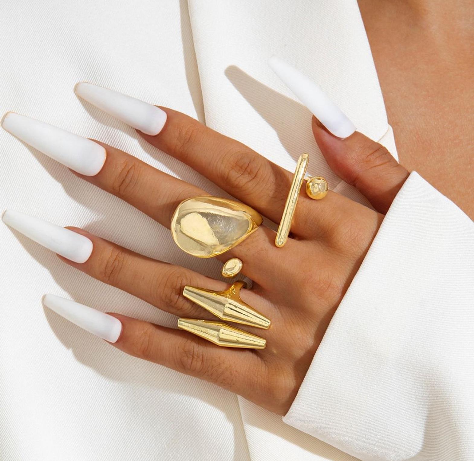 A versatile collection of 10 rings featuring a mix of chunky, irregular gold bands and dainty rings accented with minimalist pearls and geometric details, designed for customizable stacking.