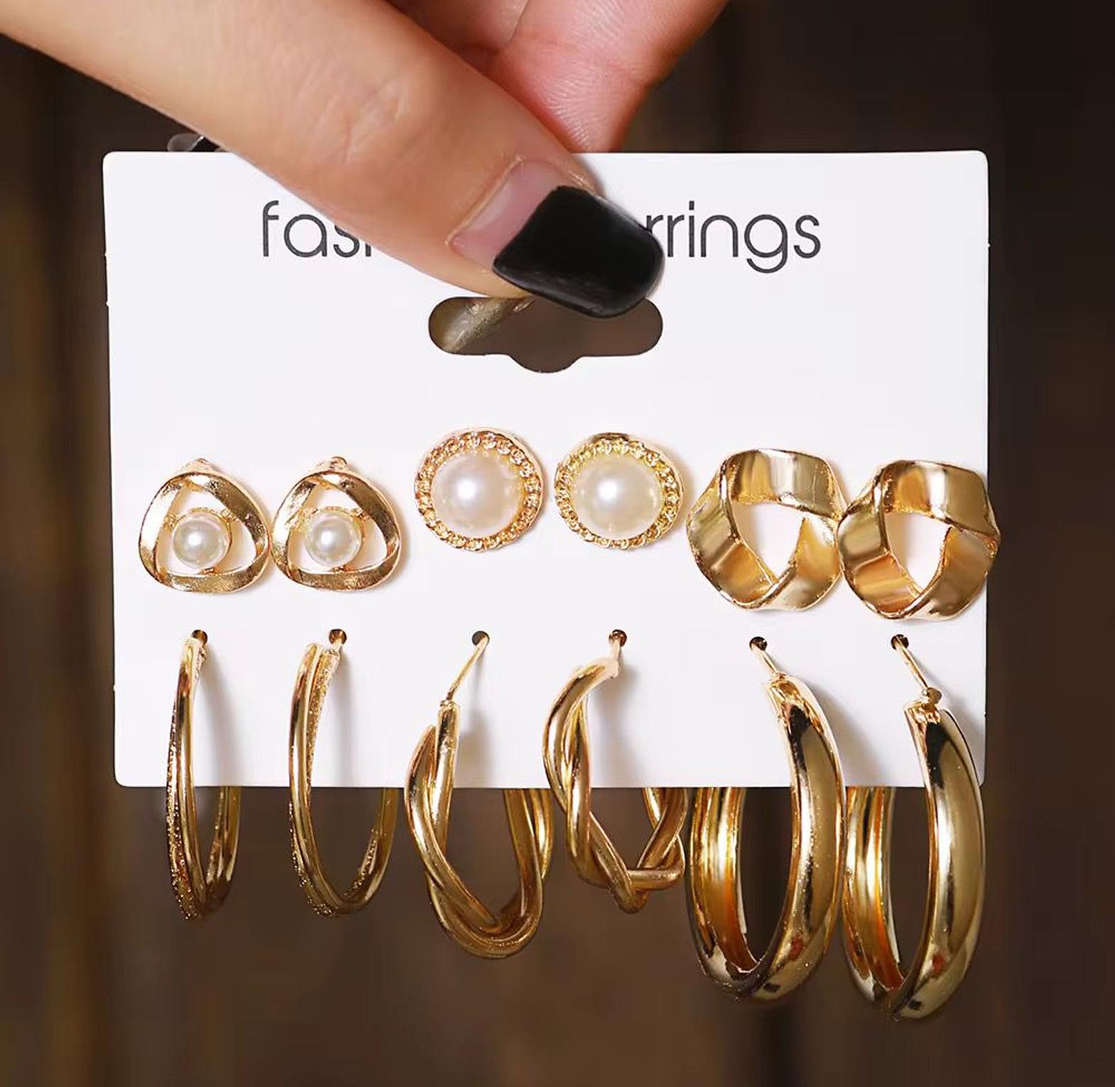 Elevate your accessory game with this versatile 6-pair earring collection, designed to provide a rich variety of textures and styles for any look. The entire set is finished in a warm, polished gold-tone color, ensuring a cohesive and luxurious aesthetic.