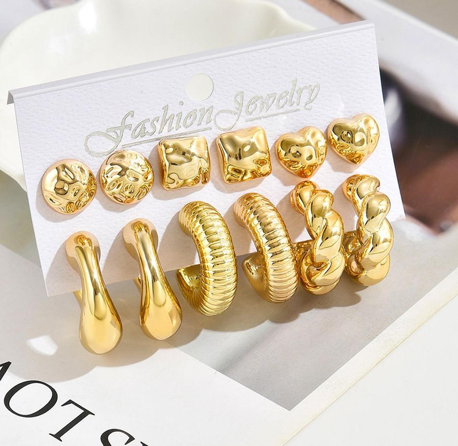 This is a set of gold-toned fashion earrings featuring stud and hoop styles with geometric, water drop, and heart design