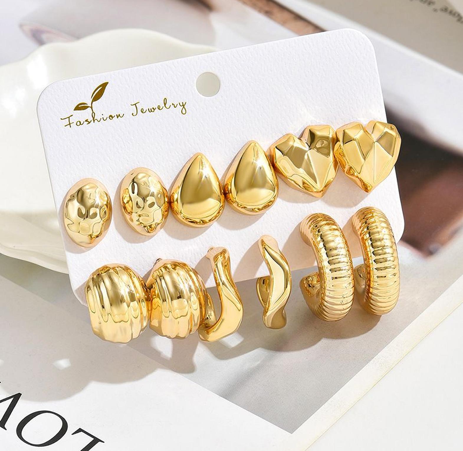 This is a set of gold-toned hoop and stud earrings in various shapes
