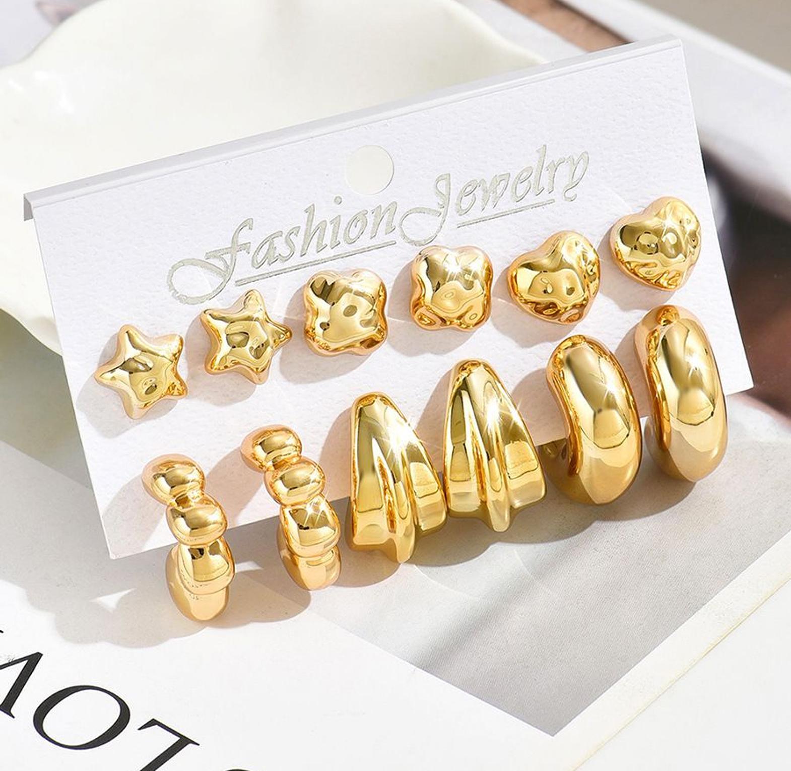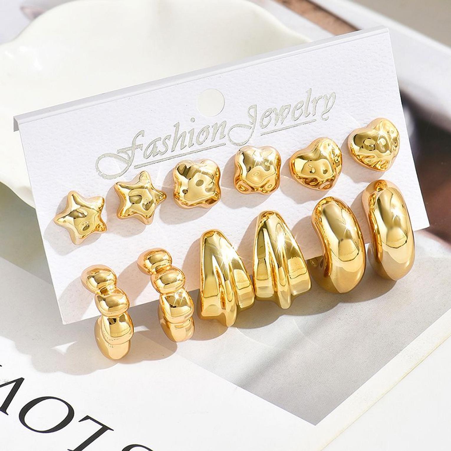 This is a set of gold-toned fashion earrings, featuring various stud and hoop styles including geometric, heart, and star designs.