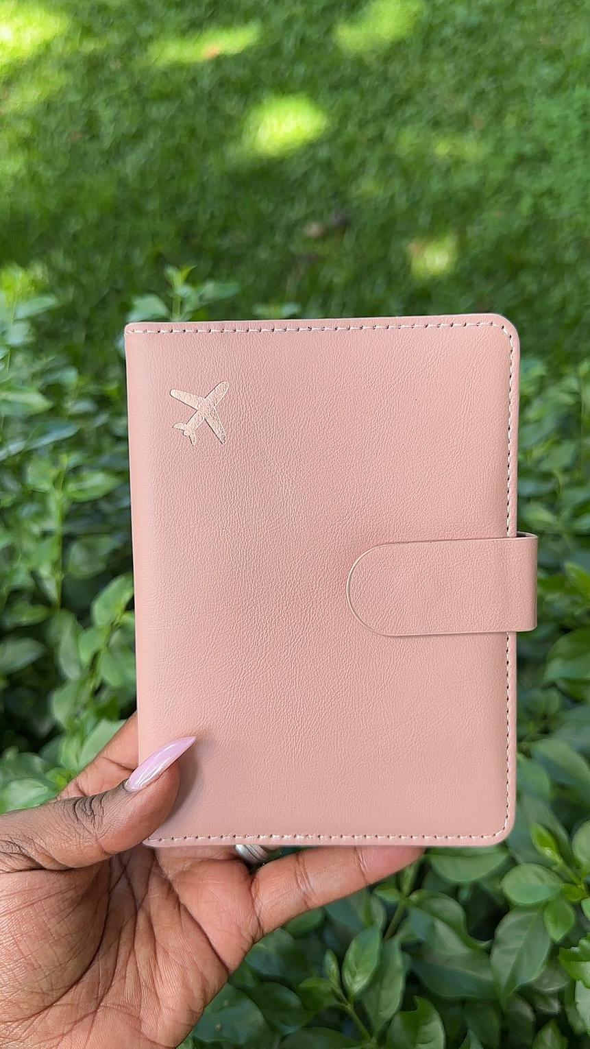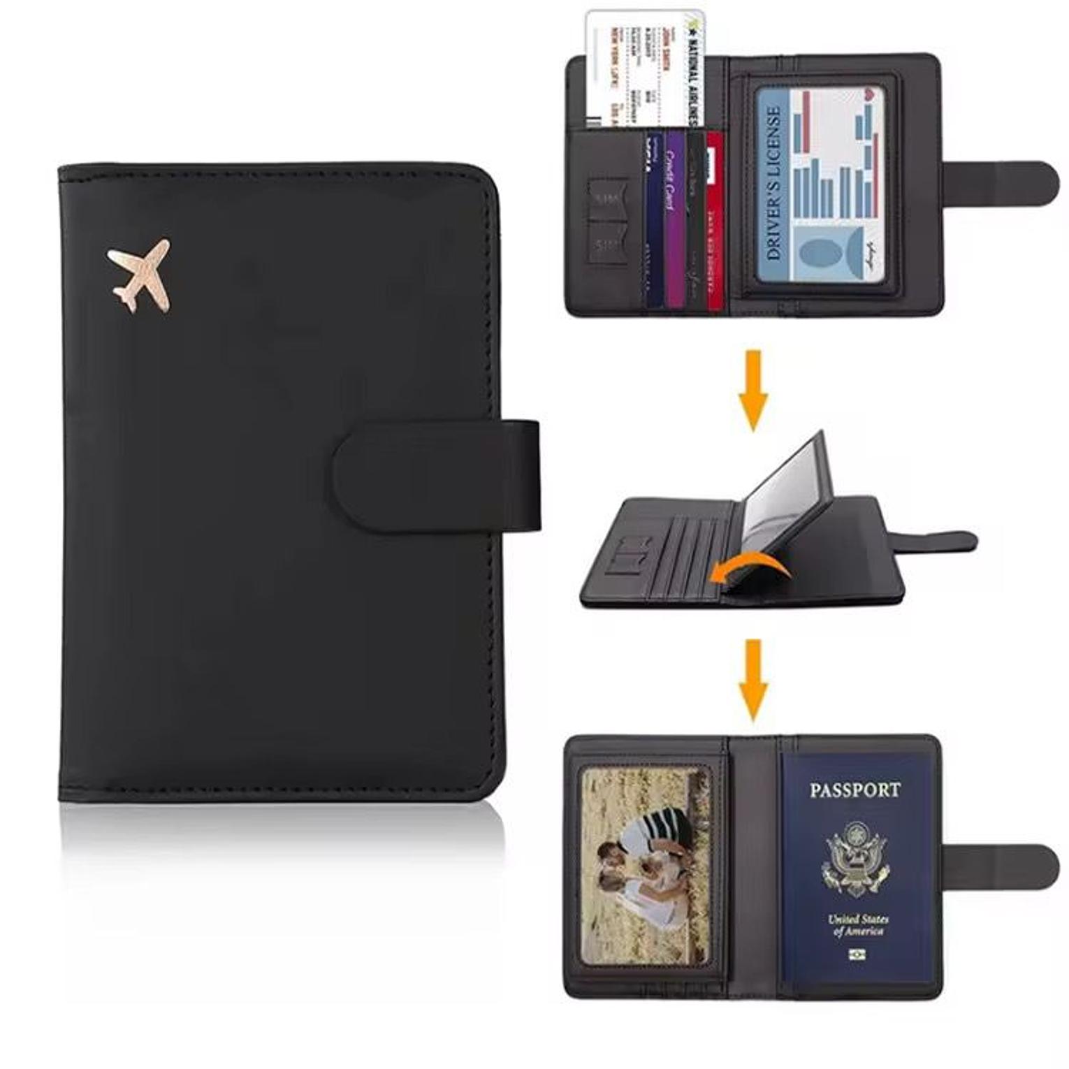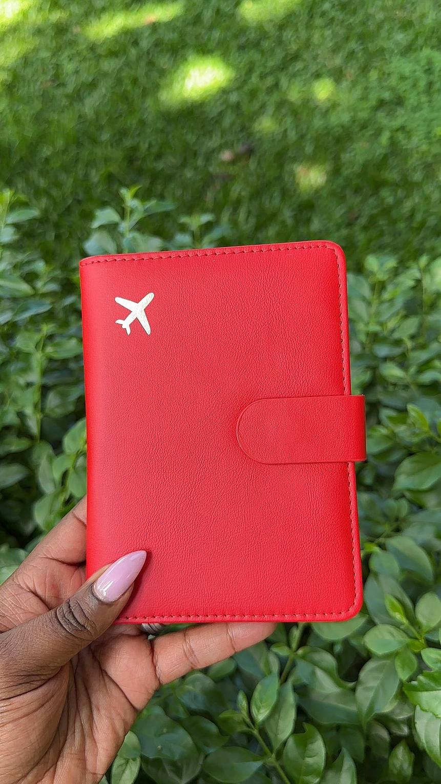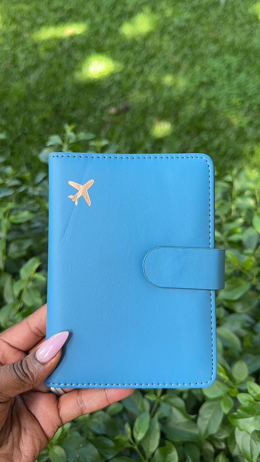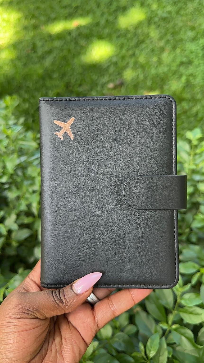 It features a minimalist design with a small airplane logo on the front. The holder has a snap button closure to secure travel items. It can hold a passport, cards, cash, tickets, and other documents.