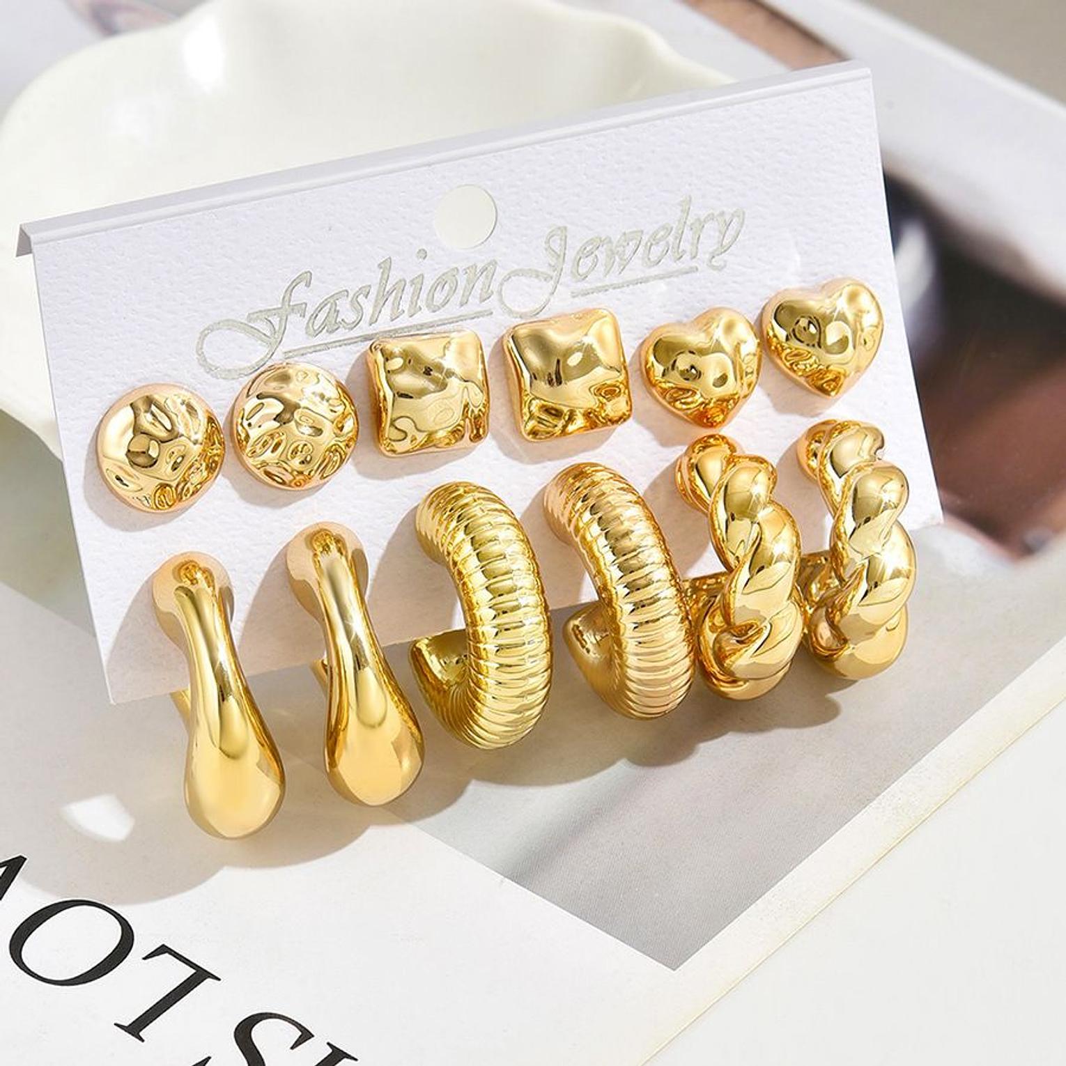 This is a set of gold-toned fashion earrings featuring stud and hoop styles with geometric, water drop, and heart design